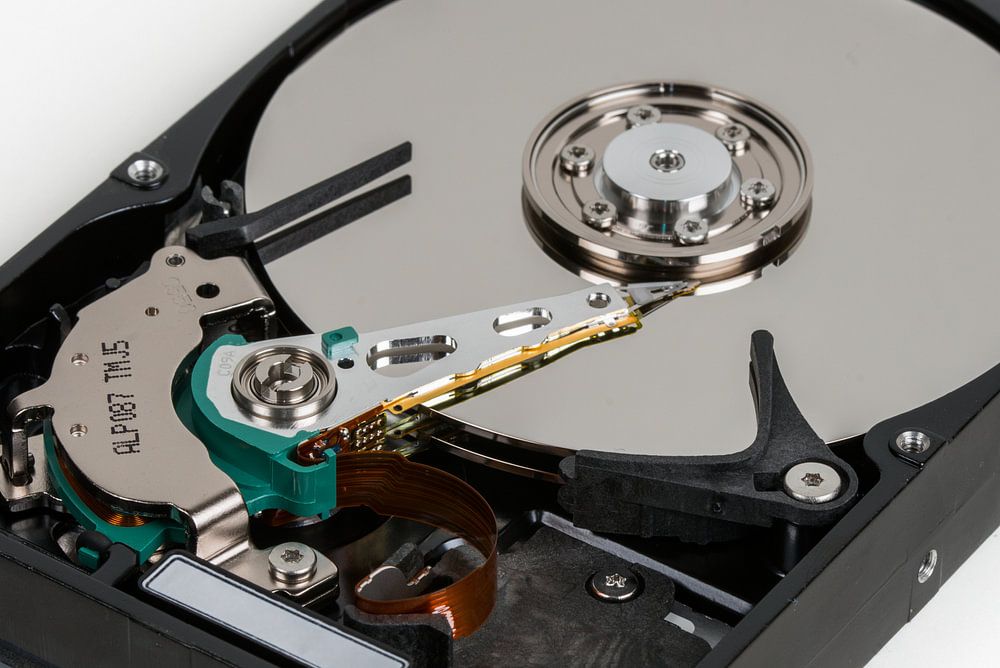 Oude HDD - harde schijf - interieur met magneetschijven en leeskop