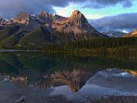 Landschapopname van de Canadese Rockies nabij Canmore, Alberta bij zonsopgang met de top van Ha Ling Peak weerspiegeld in het ondiepe heldere water van Rundle Forebay Lake omgeven door dichte naaldbossen in de herfst.