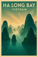 Dit kunstwerk vangt de betoverende schoonheid van Ha Long Bay in Vietnam, een UNESCO Werelderfgoedlocatie die bekend staat om haar smaragdgroene water en torenhoge kalkstenen karsten. Weergegeven in een Art Deco reisposter stijl, roept de afbeelding mysterie en verwondering op, met gelaagde kliffen die zich uitstrekken over een kalme, mistige horizon. Het samenspel van gouden licht en diepgroene tinten creëert een dromerige sfeer die zowel majestueus als sereen aanvoelt.