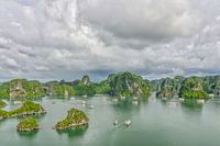 Cruiseschepen en traditionele jonken met toeristen in het UNESCO werelderfgoed Ha Long Baai in Vietnam met zijn duizenden karst eilanden.