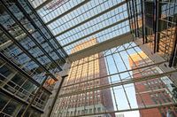 Het nieuwe ministerie van binnenlands zaken rijst op vanuit het atrium van het ministerie van volksgezondheid, welzijn en sport. Dit is de nieuwe spectaculaire nieuwbouw vlak naast het centraal station van Den Haag. Waar deze nieuwe baksteenkleurige torens nu staan stond ooit de zwarte madonna, een wooncomplex dat het niet lang heeft volgehouden tot het na veel controverse weer werd gesloopt om plaats te maken voor deze torens