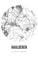 Zwart-witte landkaart, stratenplan of plattegrond van Haalderen. Haalderen is gelegen in de Betuwe, in de gemeente Lingewaard, provincie Gelderland. Op de stadskaart zijn alle openbare wegen in Haalderen opgenomen. Verder is de kaart voorzien van de coördinaten van het centrum van Haalderen.
