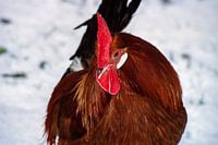 Haan in de sneeuw in een tuin in Holland/ Rooster in the snow in a backyard in the Netherlands