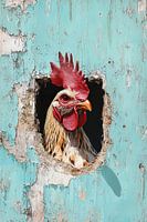 Haan | Through the Window Gaze - Dit dierenschilderij toont een haan die alert kijkt vanuit een ruw uitgesneden gat in een levendig turkooisgekleurde muur.