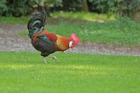 Haan in het open veld met mooi groen gras; mannelijke vrije kip, hoendervogel of hoen, hen. Fraai gekleurde vogel op strak gemaaid gras. Omgeving kasteel Amerongen.