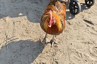 De trotse, kleurrijke haan in het prachtige gouden zonlicht was de ster van de show. Alle aandacht van de groep leerlingen was op hem gericht.