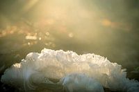 IJshaar, de baard van Koning Winter op een stuk dood hout tijdens een koude ochtend in een bos in de winter. Haarijs is een zeldzaam fenomeen dat alleen voorkomt bij specifieke temperaturen en vochtigheid.