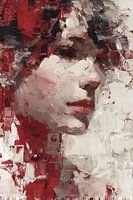 Dit expressieve werk toont een vrouwengezicht in zijaanzicht, opgebouwd uit krachtige, onstuimige penseelstreken in rood, wit, beige en vleugjes zwart. De schilderstijl is los en abstract, maar het gezicht blijft herkenbaar en emotioneel geladen. De compositie lijkt te balanceren tussen figuratie en abstractie: details als de mond, neus en ogen zijn zorgvuldig gesuggereerd, terwijl omliggende vlakken vervagen in een ruwe textuur van kleur en beweging.