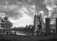 oud Haarlem een gedigitaliseerde gravure uit de 17e eeuw in zwart wit.