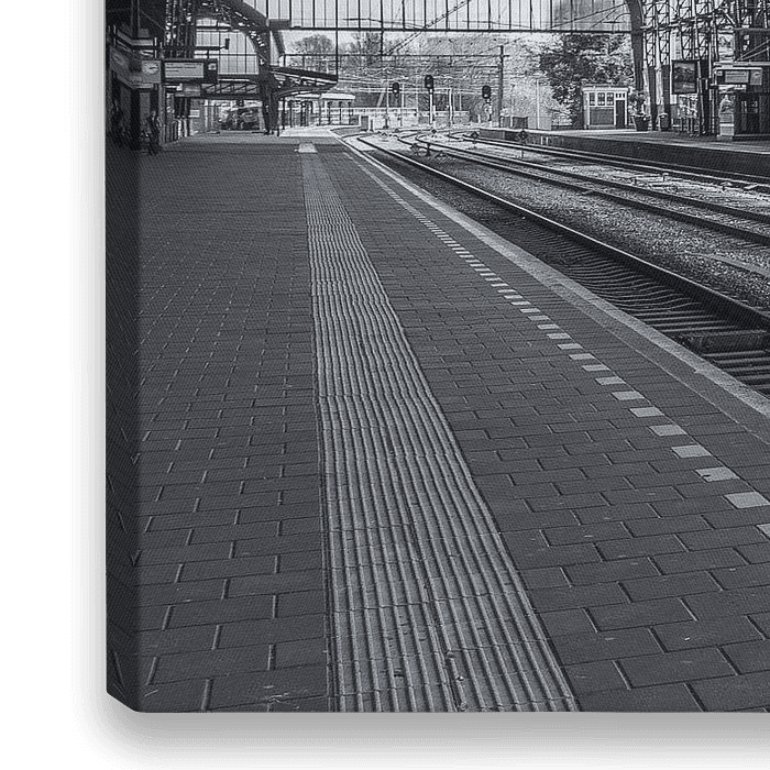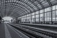 De foto van het treinstation in Haarlem is gemaakt op een middag in april 2017. Door het gebruik van een groothoeklens zijn veel details van het station zichtbaar en is er een sterke dieptewerking.