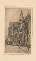 De Grote of Sint-Bavokerk aan de Grote Markt in Haarlem. Op de voorgrond wandelende figuren.