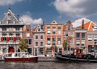 Façades van gebouwen langs de rivier de Spaarne in Haarlem.