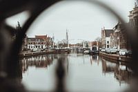 Landschapsfoto van het Spaarne in de winter met op de achtergrond de Melkbrug. Langs de gracht staan typisch Nederlandse grachtenpanden.