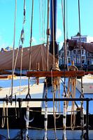 Rivier de Spaarne in Haarlem. In het centrum  ligt zeilschip driemaster de Soeverijn.
