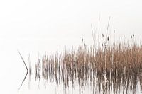 Riet aan de waterkant in het Haarlemmermeerse Bos te Hoofddorp op een mistige ochtend. Het water kleurt wit door de mist en de weerspiegeling van het riet is er goed in te zien. De foto straalt sereniteit en kalmte uit. Mooi werk om te ontsnappen aan de hectiek van de dag.