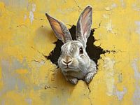 Haas | Curious Eyes Amidst Yellow - Dit dierenschilderij toont een realistisch geschilderde haas die door een gescheurde opening in een felgele muur gluurt, waarbij zijn alerte blik en gedetailleerde vachtpatronen nadrukkelijk naar voren komen.