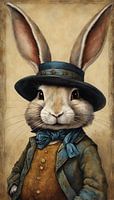 Haas Konijn met hoed en kostuum met blauwe hoed en kostuum. Mooie aardetinten.
