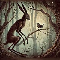 haas, vogel, bos, nachtdier, sprookje, donker bos, illustratie, dierenportret, magisch realisme, fabelachtig, gothic natuur, kinderboekstijl, boomtak, stilte, verhaal zonder woorden, mysterie, haas en vogel, donkere kunst, bosdieren, vintage dierenillustratie