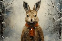 Haas in winterlandschap. Humoristisch portret van een haas met winterkleding in een winters landschap. Kies zelf het formaat en materiaal bij dit werk en maak er een echte blikvanger voor je interieur van!