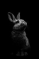In subtiel zwart-wit steekt het delicate, nieuwsgierige konijn elegant af tegen de donkere achtergrond. Zijn grote, expressieve oren en zachte blik stralen een stille gratie uit. Perfect voor in de woonkamer, het voegt een gevoel van rust en natuur toe aan de sfeer en trekt de aandacht als een betoverend kunstwerk.