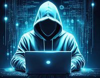 Man met capuchon en capuchon voor een laptop en verlichte blauwe achtergrond