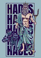 De god van de onderwereld, Hades, staat met een drietand en zijn driekoppige hond Cerberus voor een dramatisch geënsceneerde achtergrond. Een krachtig motief uit de Griekse mythologie, indrukwekkend geïllustreerd.