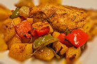 Hähnchenfilet an pikanten Potpourri, bestehend aus Kartoffeln,Paprika und Birnen im Backofen geschmort.