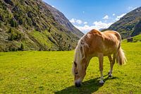 Paard (haflingerras) in een weide in het Venter tal Vent in het Ötztal in Tirol Oostenrijk tijdens een mooie lentedag in de Alpen.