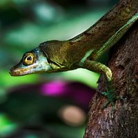Close up portretje van een hagedis op een boom in de jungle van Tobago. Tobago is een eiland in het Caribisch gebied. Deze hagedis is prachtig van kleur en haar scherp gefotografeerd. De kleuren en structuur van zijn huid zijn enorm gedetailleerd. Het reptiel zijn tegen een boom gekleeft met zijn pootjes. Het zonlicht schijnt nog net op…