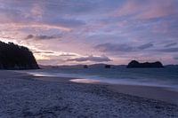 Hahei Beach sunset, paarse en lila gekleurde wolken, zee, eilandjes, rotskust, spiegeling in de branding maken dit stukje kust met zonsondergang in Nieuw Zeeland werkelijk prachtig.