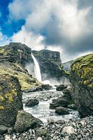 Zicht op de Háifoss waterval vanaf de Fossa rivier in IJsland tijdens een stormachtige dag in de zomer. Het water van de Fossa rivier valt diep in een canyon met kleinere watervallen rondom.