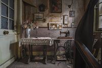 Een verlaten huisje met in de hal nog een oude trapnaaimachine en een tafel met kunstbloemen. Door de jaren dat het nu leegstaat zit alle onder het stof en door lekkage komt het behang van de muur en verschijnen er overal vlekken.