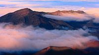 Zonsondergang boven de wolken op 3000 meter bij de Haleakala vulkaan, Maui, Hawaii.