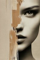 Een close-up van een gezicht. Een brede, ruwe verfstreek loopt verticaal over één helft, alsof het portret halverwege is onderbroken. Modern portret.