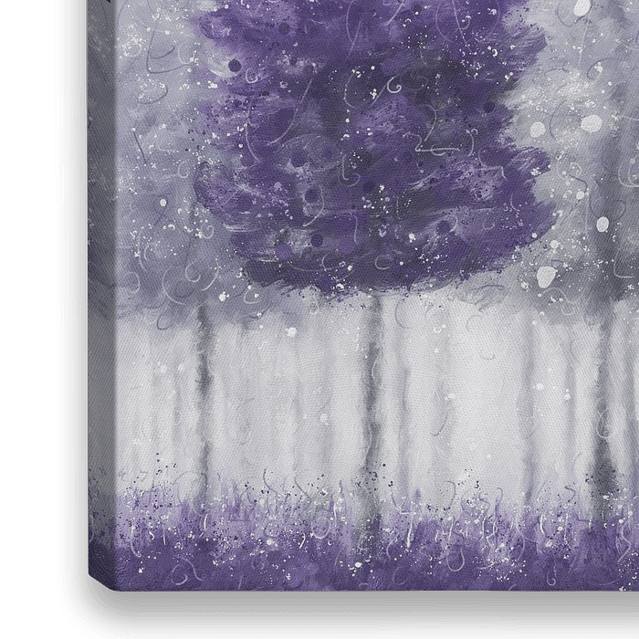 Een serene bosscène met paarsgekleurde bomen in een mistig landschap vol sneeuw. De zachte kleurverlopen en subtiele schaduwen creëren een rustige en dromerige sfeer en versterken de etherische kwaliteit van de omgeving.