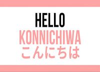 Deze afbeelding bevat de begroeting "Hello" in het Engels, geromaniseerd Japans "Konnichiwa," en het Japanse schrift こんにちは. Het ontwerp maakt gebruik van vetgedrukte zwarte en zachtroze tekst voor duidelijkheid en toegankelijkheid, ideaal voor het introduceren van Japanse begroetingen.