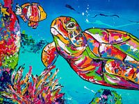 Kleurrijk schilderij met een schildpad kijkend naar een vis van de kunstenaar Renate Rolefes.