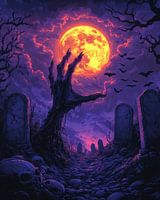 Een digitale illustratie met een griezelig kerkhoftafereel onder een bloedrode maan. De lucht is gevuld met donkere wolken en een grote, vurige maan domineert het midden van de afbeelding. Silhouetten van bomen en grafstenen omzomen een pad dat in de verte leidt, wat een gevoel van mysterie en onbehagen creëert. Een skelethand komt…