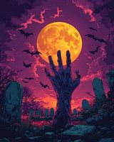 Een digitale illustratie met een griezelig kerkhoftafereel onder een bloedrode maan. De lucht is gevuld met donkere wolken en een grote, vurige maan domineert het midden van de afbeelding. Silhouetten van bomen en grafstenen omzomen een pad dat in de verte leidt, wat een gevoel van mysterie en onbehagen creëert. Een skelethand komt…