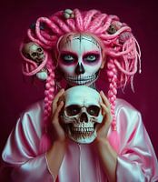 Een meisje met roze haar, met lange vlechten, ziet er griezelig en spookachtig uit terwijl zij een schedel in haar handen heeft. Het is bijna Halloween en zij bereid zich voor op de mooiste tijd van haar leven. Zij heeft zich geschminkt als op De Dag van de Doden. Het beeld is met behulp van ai gegenereerd.
