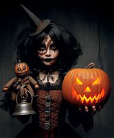 Dit mooie meisje geniet van deze periode van het jaar, Halloween, met pompoenen en monsters. Haar hele gezicht is geschminkt alsof er hechtingen in zitten. De pop pompoen heeft een heel eng gezicht en de grote pompoen gloeit. Het beeld is met behulp van ai gegenereerd.