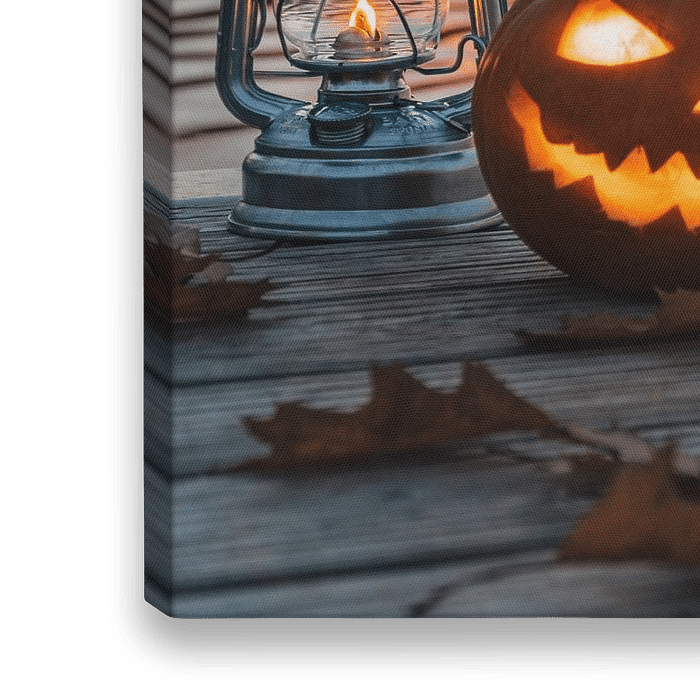 Een Halloween-pompoen op een loopbrug bij zonsondergang. Hij wordt vergezeld door een handlamp.