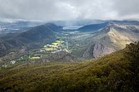We starten bij de Boroka Lookout, waar we een geweldig uitzicht hebben over Halls Gap. Het ligt tussen twee bergketen in, vandaar de naam. Ook zien we hier de Halls Gap River.