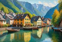 De pastelkleurige huizen van Hallstatt staan langs de waterkant, hun weerspiegelingen kabbelen zachtjes onder een hemel met zacht blauw en goud. De impressionistische toets van de kunstenaar vermengt berg, meer en dorp tot een naadloos droomlandschap. Een kerktoren rijst elegant op tegen de alpine achtergrond en legt de charme en stilte van Oostenrijks meest pittoreske stadje aan het meer vast.