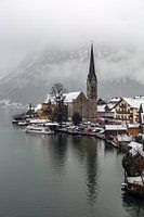 Een foto van de kerk in Hallstatt, Oostenrijk. De bergen zijn slecht zichtbaar door de sneeuw en mist.