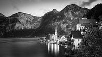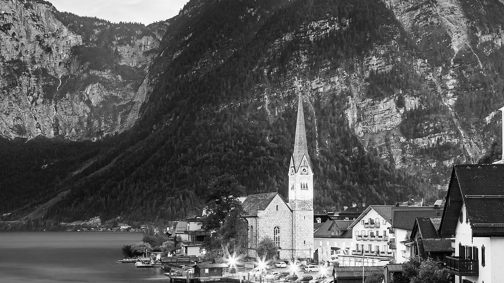 Een horizontale 16:9 Zwart-Wit foto van een vroege ochtend in Hallstatt in Opper-Oostenrijk. Een klein maar toeristisch dorpje in het Salzkammergut, een regio in Oostenrijk.
