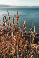 Het verdroogde gras steekt mooi af tegen de blauwe zee.