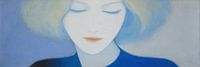 Het tweede opvallende element is de grote blauwe halogloed die het hoofd omhult en het figuur verbindt met de achtergrond. Geen harde lijnen, maar zachte overvloeiende lagen: poederblauwe en kobaltblauwe velden die in elkaar ademen, een lichte verschuiving naar grijzige tonen aan de randen. De kraag of kleding is diepblauw en vormt een anchoring, een contrasterend vlak dat het fragiele gezicht nog scherper doet lijken. Deze combinatie van helder, koel blauw en warm perzik in de lippen zet een kleine, maar doeltreffende spanningsboog op — alsof het schilderij vrouw en achtergrond constant een zachte ruil van aandacht doen.