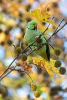 Halsband parkiet (Psittacula krameri) op een tak met herfstkleuren