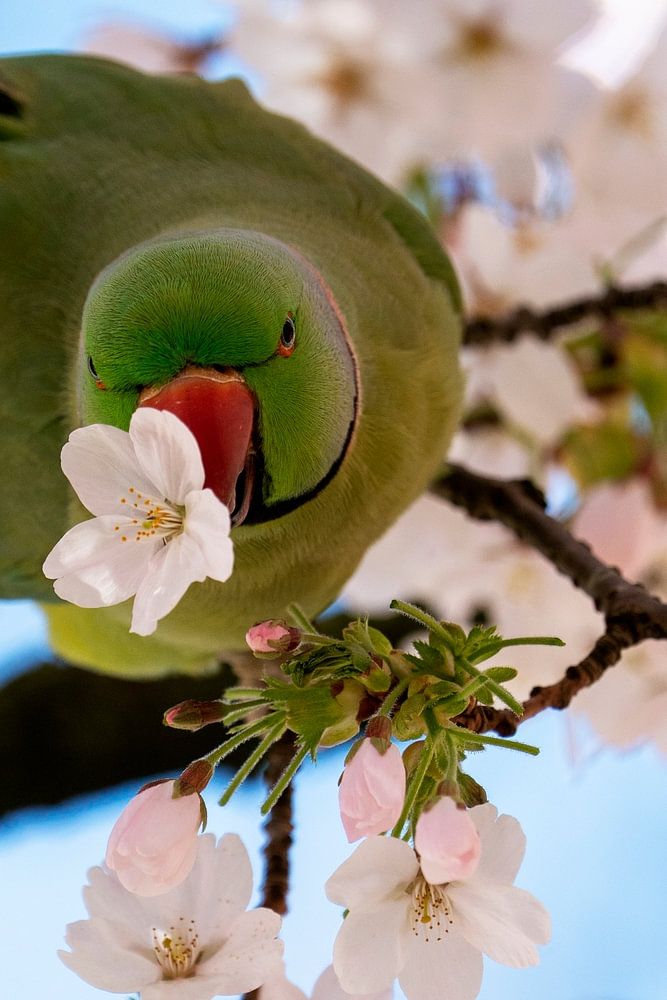 Deze foto is gemaakt in Amsterdam, waar halsbandparkieten inmiddels een vertrouwd gezicht zijn. Tussen de bloeiende bomen zorgen ze voor een vleugje tropische energie in het stadsbeeld.